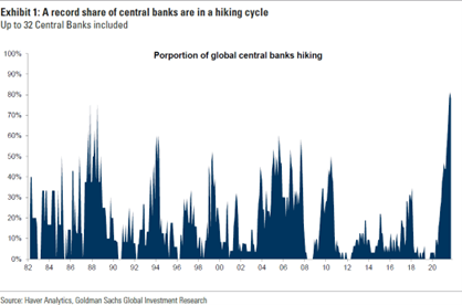 Without question, this year’s volatility has been driven by central banks around the World finally acknowledging inflation as a problem that needs to be dealt with before inflation expectations become unanchored – something we have discussed in prior client letters. As you can see in the chart below, central banks have been unusually unanimous in raising interest rates so far this year.