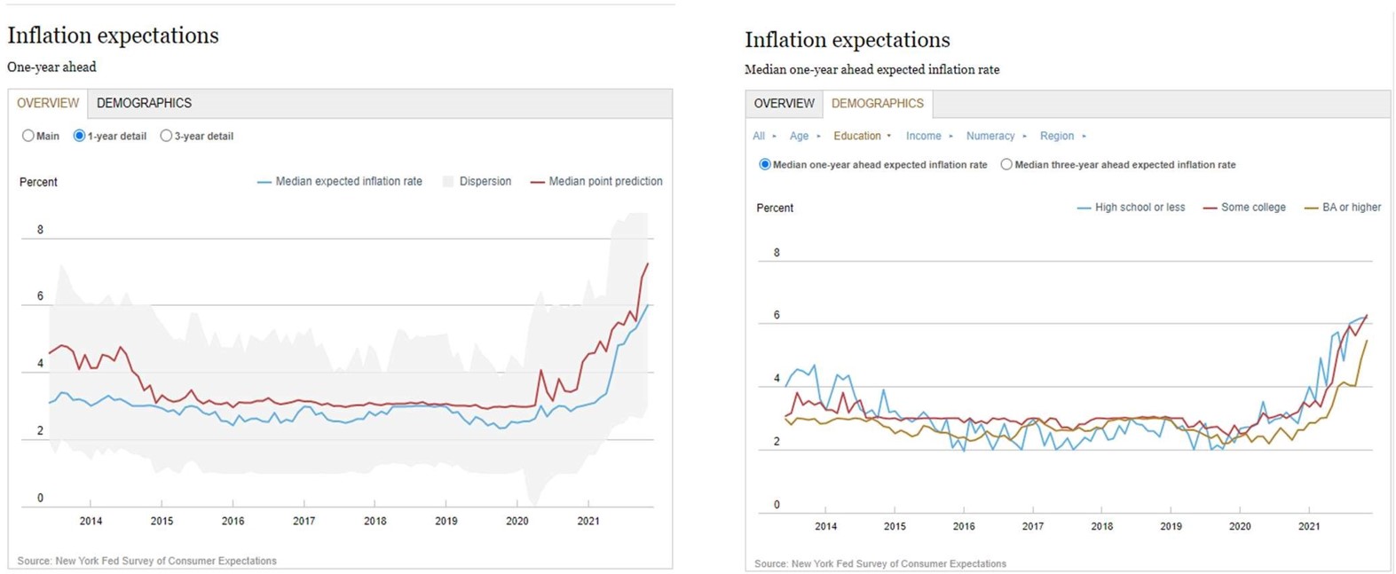 Inflation has been a hot topic of late in both the general and financial press. For the first time in a very long time people have been surprised by a significant pick up in the prices of all sorts of items: from food, to clothing, and to energy, prices have risen dramatically. This is causing concerns about changes in inflation expectations and how that will impact the ability of global central banks to manage their economies. Jeremy Rudd, a researcher at the Federal Reserve, has recently put out a paper that is most provocative. He directs his arguments at an axiomatic idea in economics: that expectations determine inflation. The conventional story is straightforward. When workers expect prices to rise, they demand higher wages. When firms expect costs to rise, they set higher prices. In both cases, inflation becomes a self-fulfilling prophecy. A central banker’s task is to pin down expectations at a low, stable level. If they succeed, they can control inflation. This idea also appears to have been remarkably successful. For the past three decades inflation in the developed world has been quiescent. Whenever it has shot above target, it has, soon enough, fallen back. Expectations are, in the parlance, “well anchored.” Indeed, this is why many economists are sanguine about the current bout of inflation: supply disruptions will eventually pass, and price pressures will ease. It is a comforting thought. Enter Mr. Rudd, the author of more than a dozen papers on inflation over the past two decades. The idea of inflation expectations “rests on extremely shaky foundations,” he writes. First, he says, the theory is flawed. Models of inflation mostly include expectations as a short-term variable (that is, what prices will be in the next month or two). Insofar as expectations matter, though, central bankers and analysts think of them as a longer-term force, an underlying trend impervious to cyclical ups and downs. Empirically, however, this is hard to document. Nevertheless, it is true that the past three decades have seen both subdued inflation and low expectations, however measured. But Mr. Rudd’s contention is that the causality has been misunderstood. It is not that low expectations led to low inflation, but rather that low observed inflation led to low expectations. As he notes, it was only after a recession in the early 1990s, when inflation fell sharply and then stayed low, that expectations were ratcheted down. Mr. Rudd concludes that obsessing over inflation expectations is useless and dangerous. Useless, because it is observed prices that count. Dangerous, because central bankers might grow unjustifiably confident in their powers of mind control. Three important arguments come out of his work. First, central-bank credibility is precious. Second, expectations of inflation are formed by experiences of inflation. And third, in the long run, such expectations probably matter. The aforementioned should help put the following charts from the New York Federal Reserve into perspective: