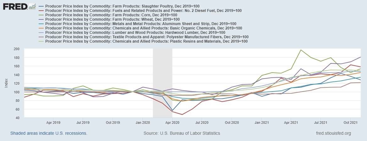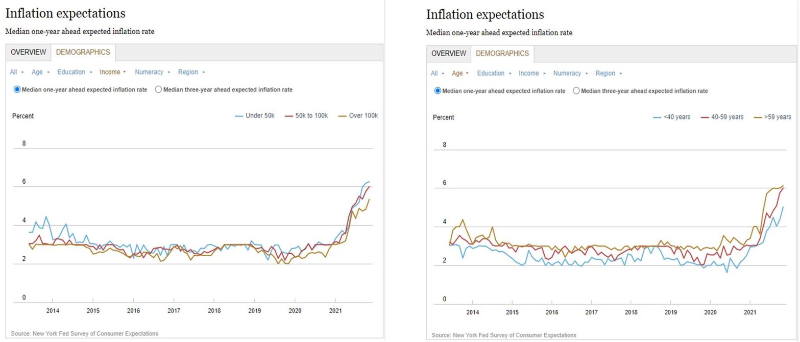 As you can see – the change in inflation expectations cuts across all demographic groups. The Federal Reserve had tried to control the narrative on inflation claiming it was both transitory and the result of comparing the prices to Covid-19 lows but finally had to retire the word “transitory” at their December meeting. The reality is that prices for all sorts of raw materials that go into items that consumers buy everyday are up between 28% and 80% – when compared to prices that existed on December 31, 2019, in other words, pre-Covid. It would appear, at least to this observer, that inflation expectations have become “un-anchored” again after the Federal Reserve spent the 1980’s repairing the damage they caused to the country during the 1970’s.