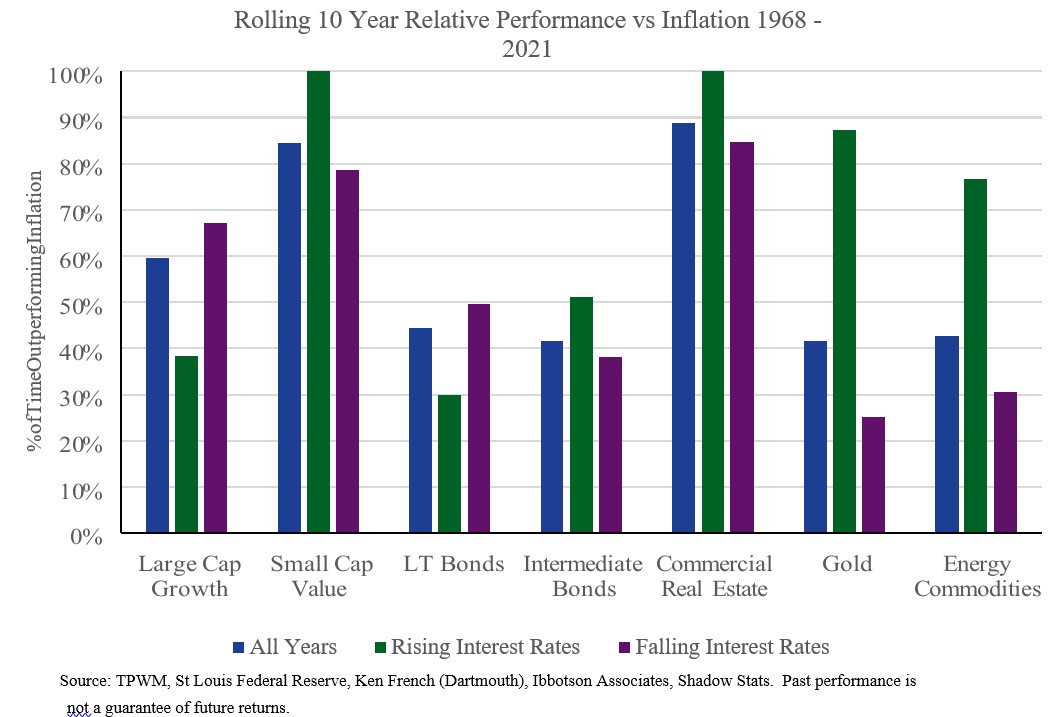 This chart has driven most of the asset allocations decisions we’ve made over the last two quarters with the green bars representing the percentage of time various asset classes outperform inflation. That is, shifting your portfolios toward smaller cap value stocks, reducing the duration (interest rate sensitivity) of the fixed income portion of your portfolio, and adding to positions in commodity related securities and real estate. All these changes are in an effort to increase the probability that your portfolios will outperform inflation and protect your purchasing power.