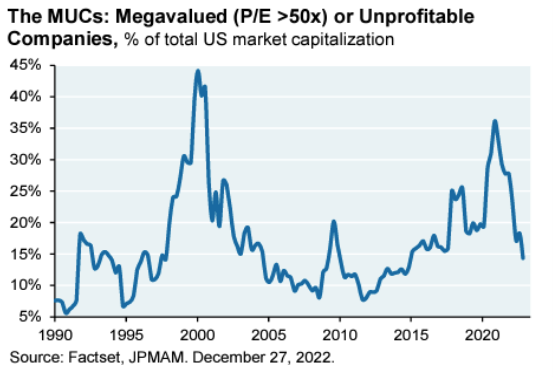 We begin this letter by acknowledging the end of an era. At the end of 2020 – after 15 years of easy monetary policies and benign inflation – global bond markets included over $18 Trillion Dollars of negative yielding debt. As of the first week of January 2023 – all of it is gone as central banks around the World spent the last year hiking interest rates in earnest. Money is no longer free – or more importantly, investors no longer have to pay for the privilege of lending an entity money. Financial markets around the World bent but did not break. Had you asked any market pundit one year ago if the Federal Reserve could hike interest rates by 425 bps over a nine-month period without financial Armageddon, they would have scoffed at the idea, perhaps fainting at the thought. Now that money has a cost, the markets have spent the last year sorting the winners from the losers. Gone (nearly) are the zombie companies that lost money for years but were propped up by a zero cost of capital. As we discussed previously, this shakeout looks very much like the popping of the Internet Bubble 20 years ago (see charts below from JP Morgan):