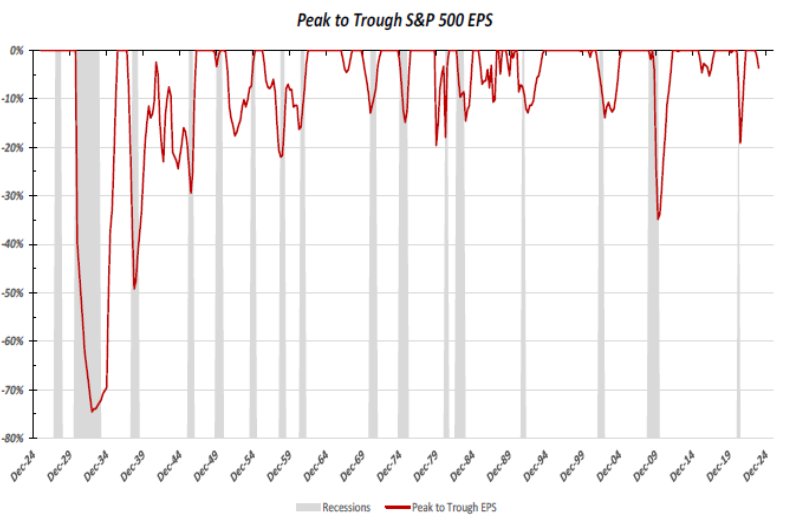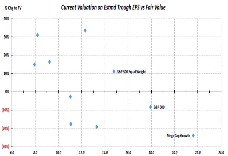 This is being done, after maintaining a duration half thatof the benchmark for the last 18 months, to benefit from the eventual decline in interest rates that normally accompanies a recession. Turning to the equity side of your portfolios, we continue to find attractively valued companies in most parts of the US equity market with the Mega Cap growth stocks continuing to be the glaring exception. Despite this year’s underperformance, the group remains overvalued according to our work that is depicted on the following chart (left) which compares current valuation to our estimate of fair value (which uses real rates, expected inflation and required risk premia). Given where we are in the economic cycle – we prefer to value stocks based on an estimate of earnings adjusted for a recessionary economy, i.e. trough earnings. Looking at the last 100 years (right), the median peak to trough decline for earnings on the S & P 500 has been 10% which is what our valuations are based upon. Looking at the three blue dots with labels, you can see the impact that the Mega Cap stocks continue to have on the valuation of the S &P 500 as the equally weighted S & P 500 (which neutralizes this impact) is undervalued. We continue to believe the quality of the companies in your portfolio and the overall asset allocation will help to mitigate the near-term global economic uncertainty.